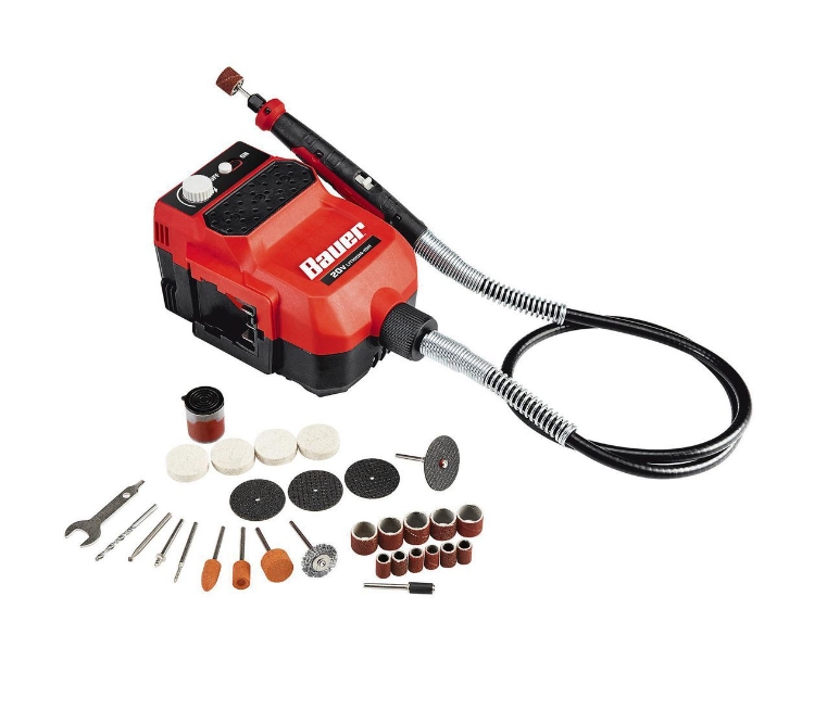 This BAUER™ 20V Variable-Speed Rotary Tool has a powerful motor and a comfortable 36 in. flexible shaft for performing detail work with minimal vibration. The kit includes 36 accessories for cutting, grinding, sanding, and polishing.